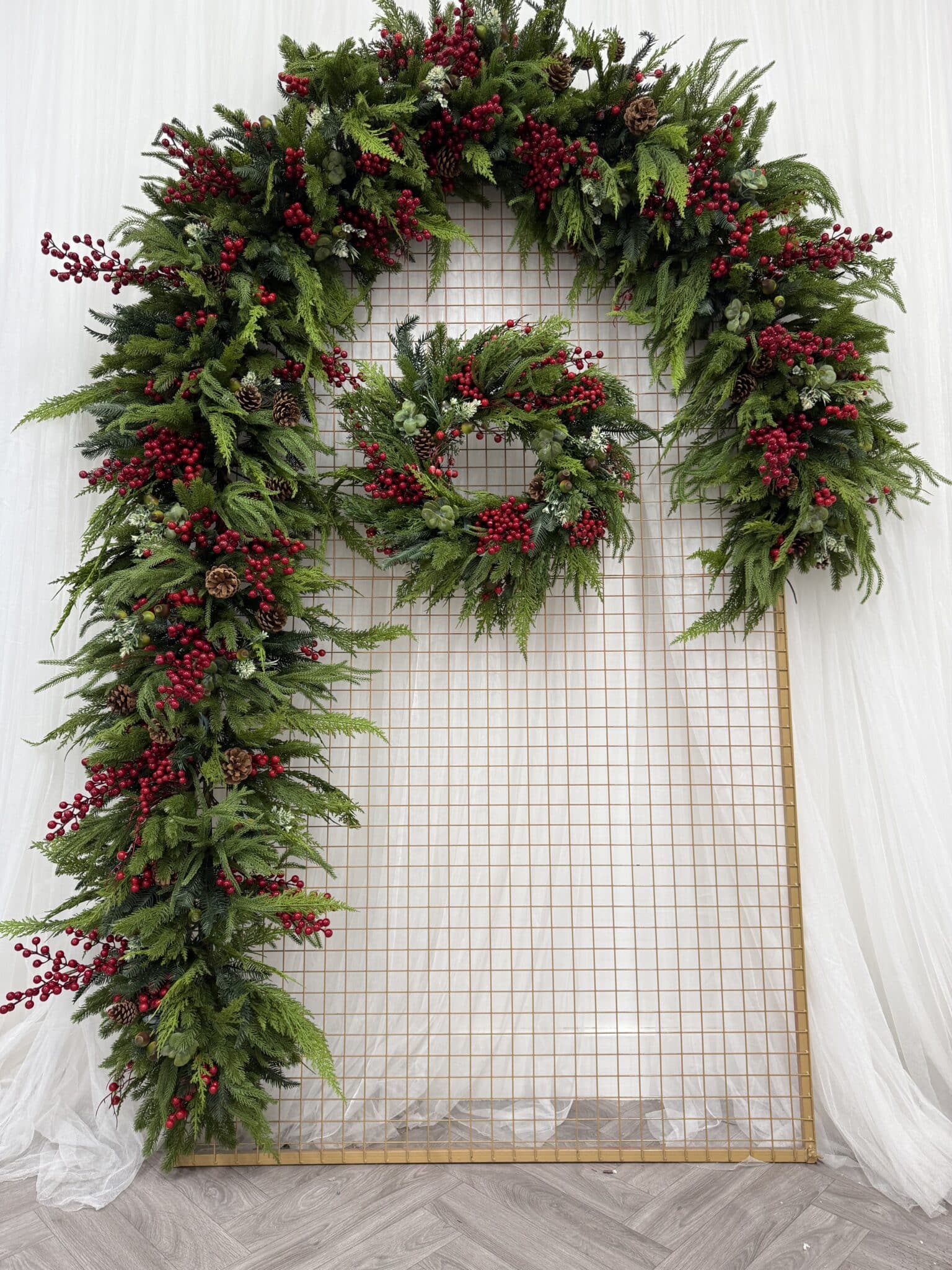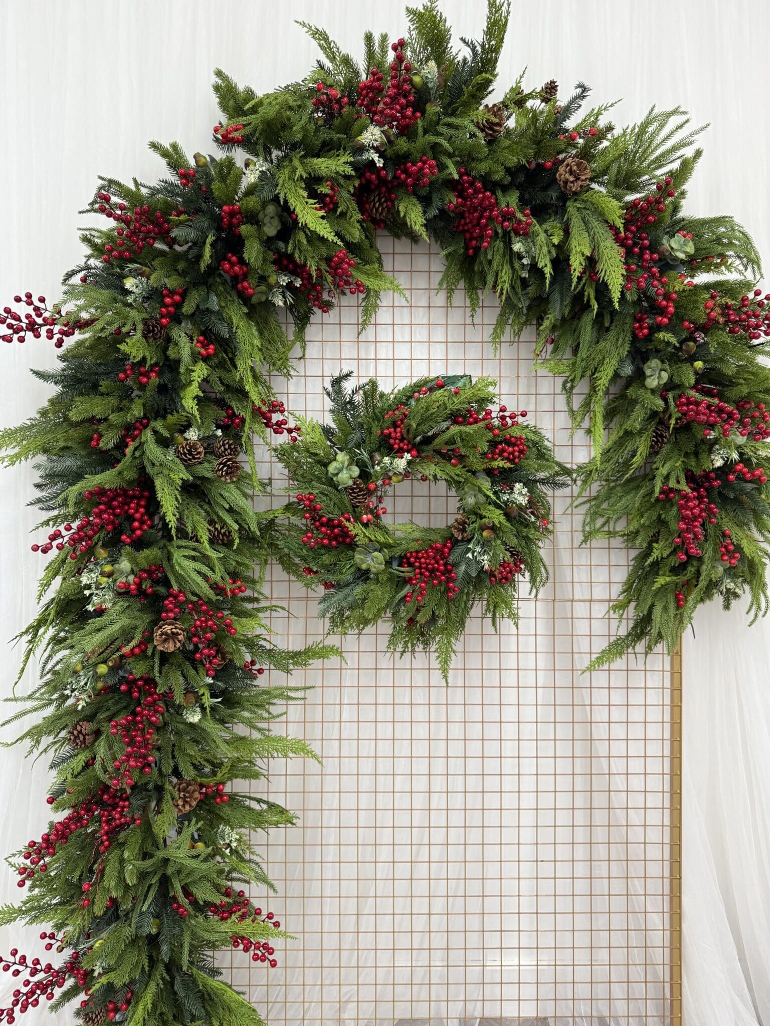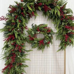 Each piece is made with exceptional attention to detail, featuring layers of realistic evergreen foliage, vibrant red berries, pinecones, and soft spruce greenery. The result is a full, natural-looking design that captures the essence of a traditional Christmas.