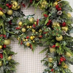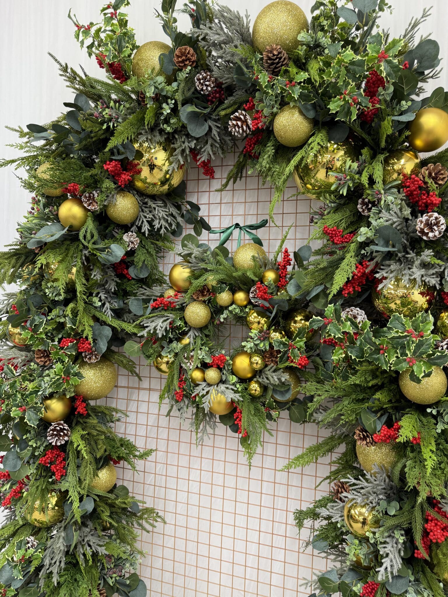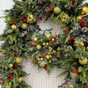 Handcrafted using premium artificial foliage, this design captures the richness and warmth of the season with a blend of lush evergreens, holly, red berries, pinecones, and shimmering gold ornaments. Each piece is arranged with precision to create a full, luxurious appearance that makes an unforgettable impression.