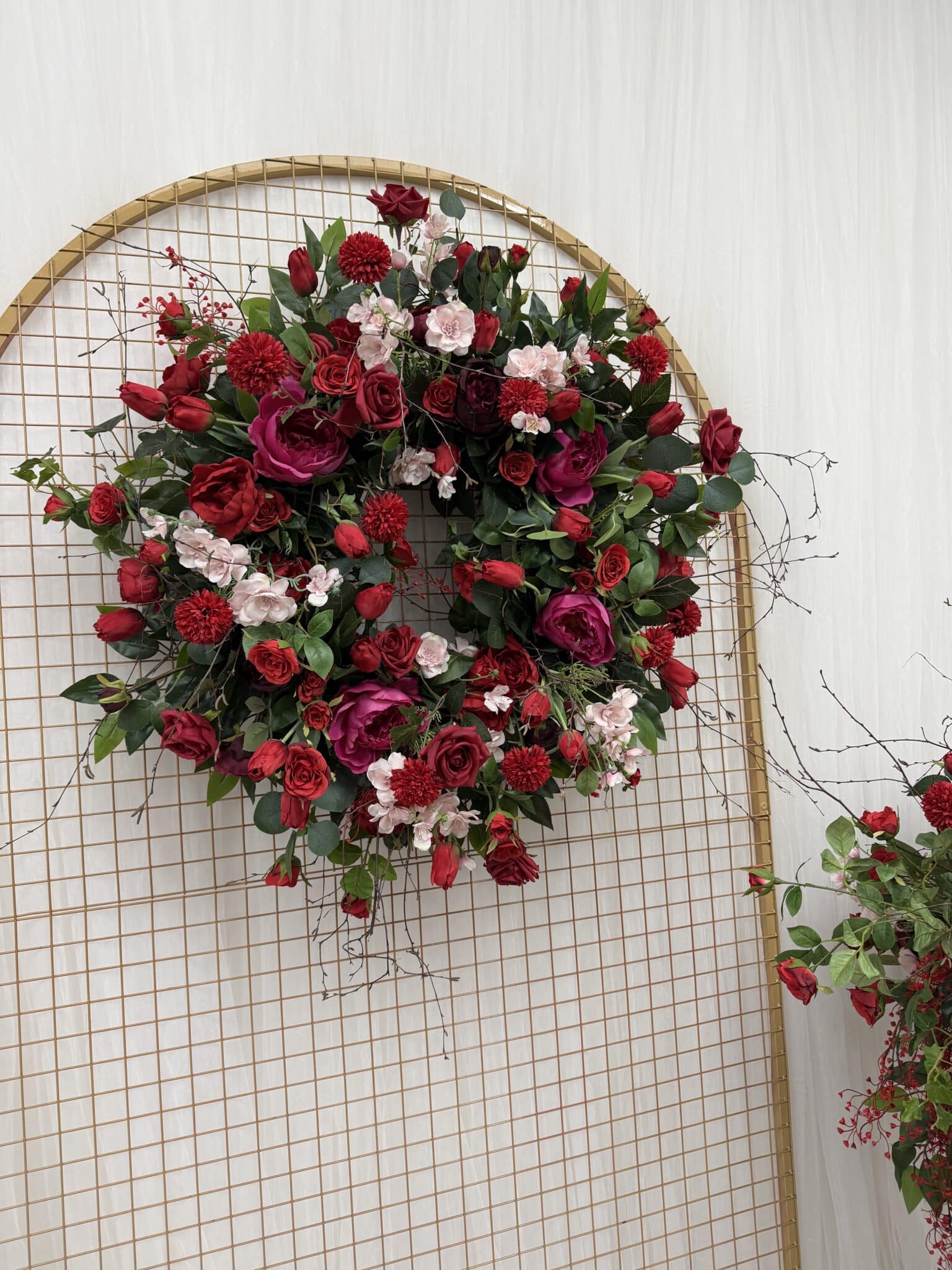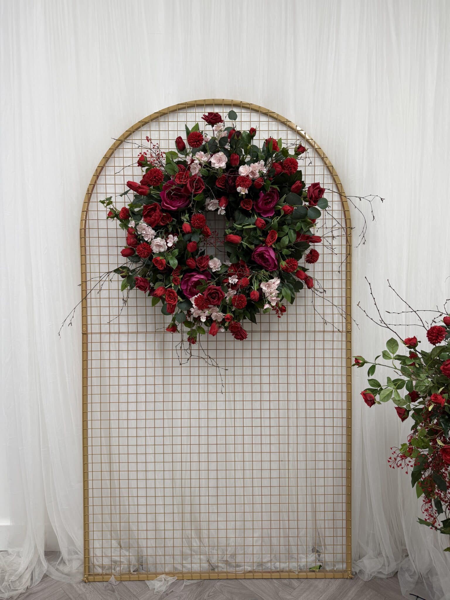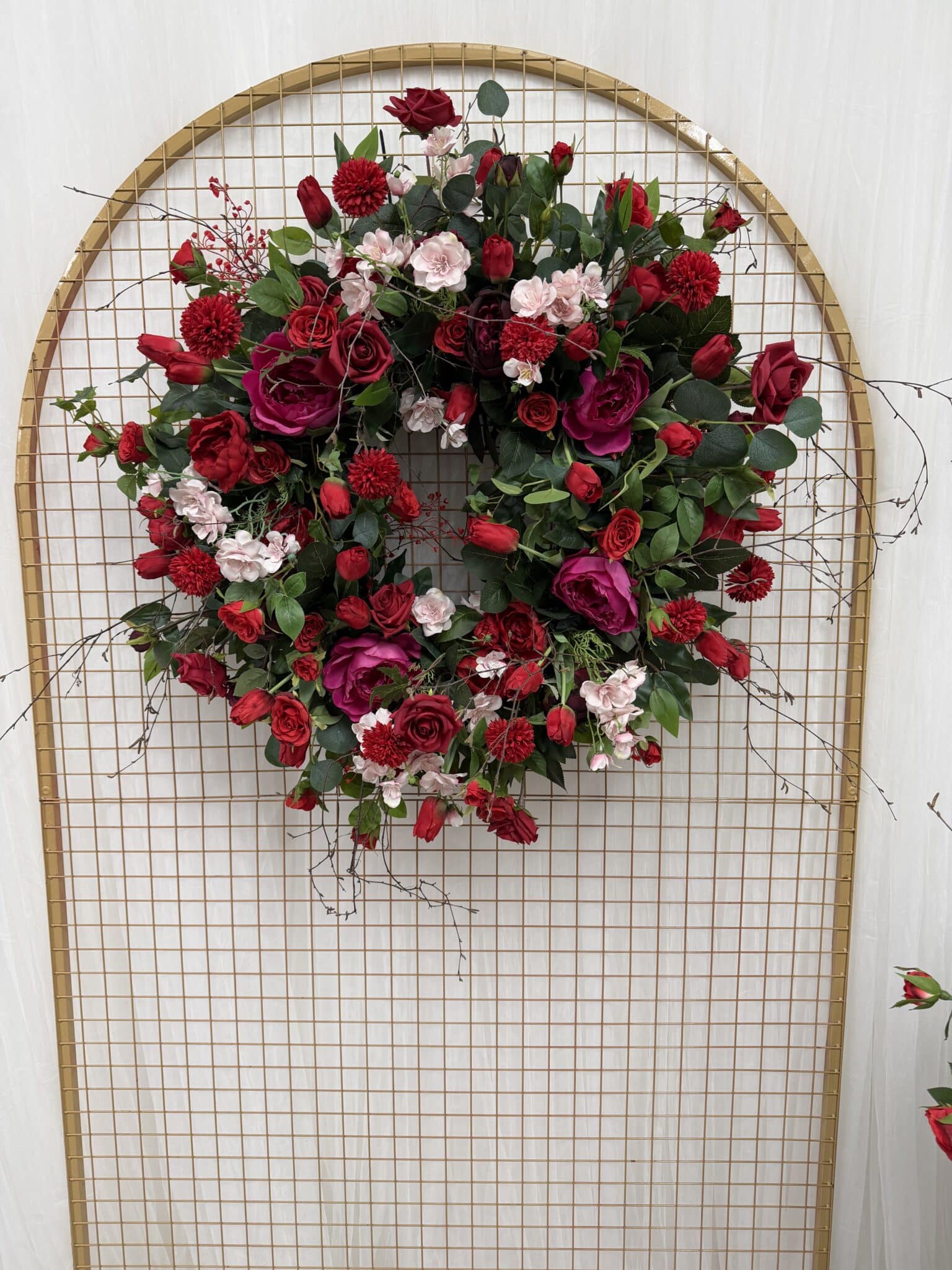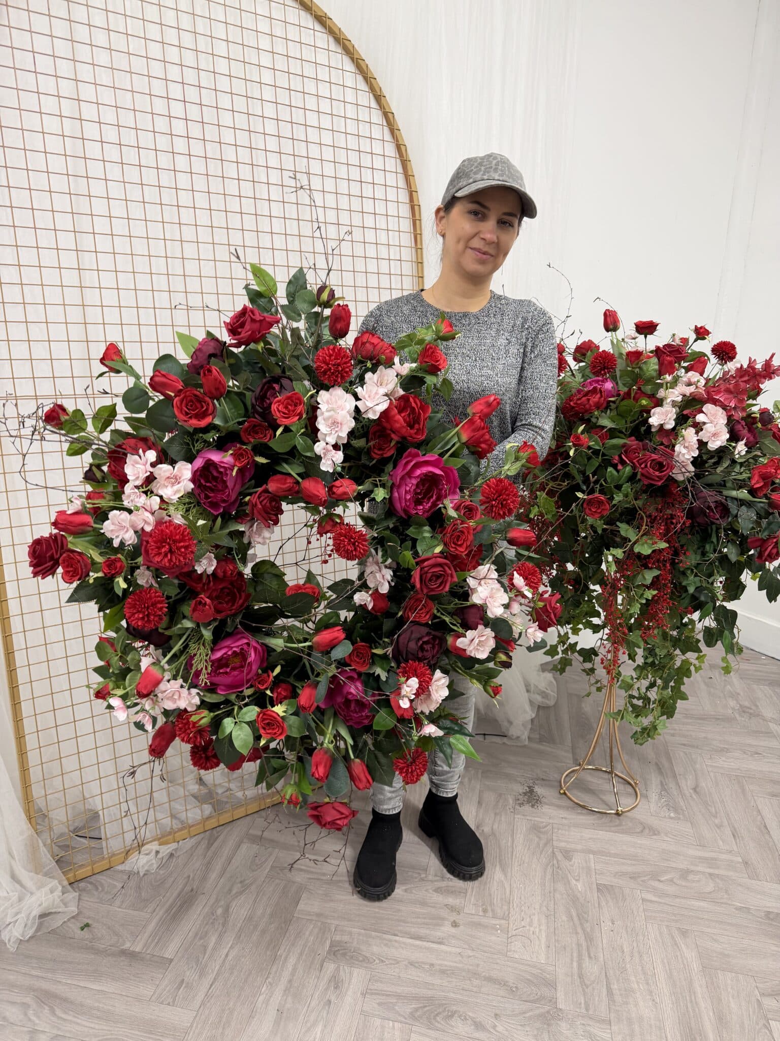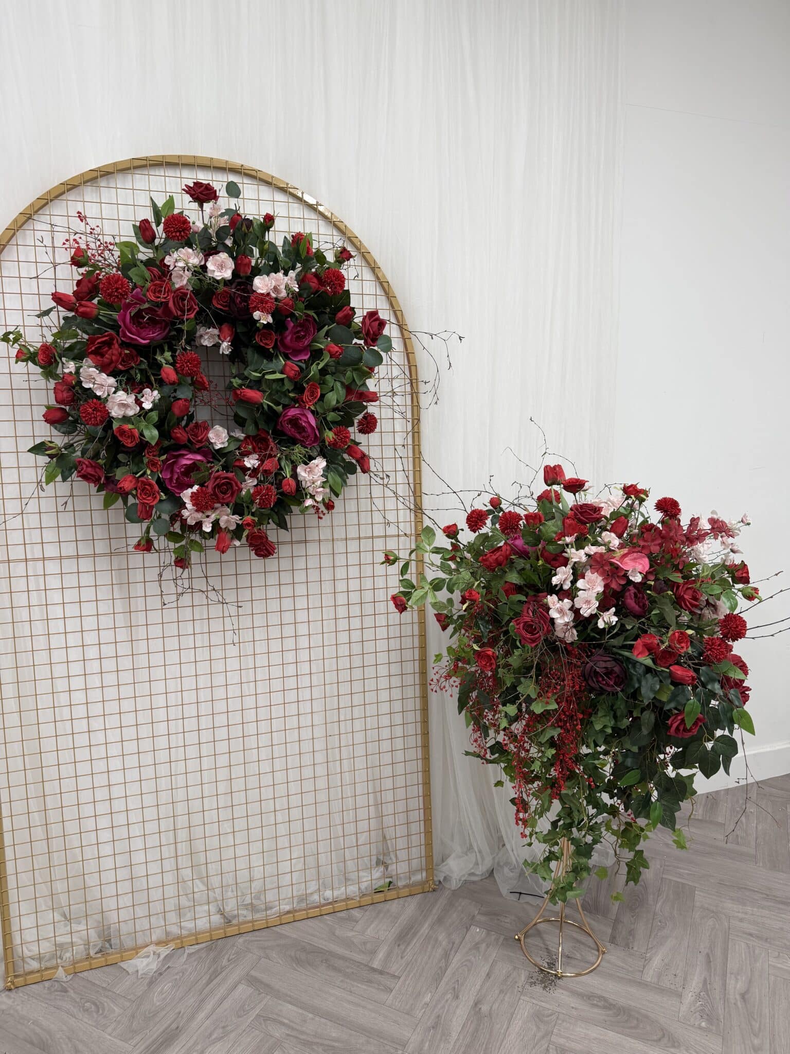 The design is built around a luxurious palette of deep red and burgundy roses, softened with blush accents, layered greenery and flowing trailing foliage. Delicate blossom details and natural twig elements add texture and movement, resulting in an arrangement that feels organic, balanced and highly realistic, closely echoing the depth and variation of fresh florals.
