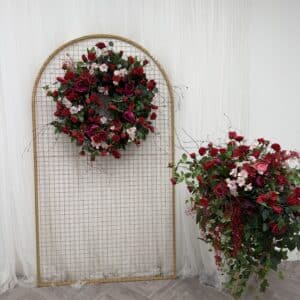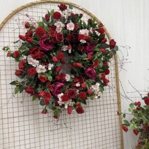 Designed to make a confident and sophisticated statement, this XL red floral door wreath and matching hanging basket bring depth, warmth and timeless elegance to any entrance.