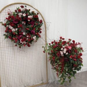 The design is built around a luxurious palette of deep red and burgundy roses, softened with blush accents, layered greenery and flowing trailing foliage. Delicate blossom details and natural twig elements add texture and movement, resulting in an arrangement that feels organic, balanced and highly realistic, closely echoing the depth and variation of fresh florals.